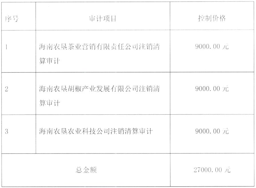 2023-08-31海南省農(nóng)墾五指山茶業(yè)集團(tuán)股份有限公司旗下海南農(nóng)墾茶業(yè)營(yíng)銷有限責(zé)任公司、海南農(nóng)墾胡椒產(chǎn)業(yè)發(fā)展有限公司、海南農(nóng)墾農(nóng)業(yè)科技公司共3家公司進(jìn)行注銷,現(xiàn)擬選聘會(huì)計(jì)師事務(wù)所依法對(duì)上述3家公司開展清算審計(jì),特邀請(qǐng)符合...
